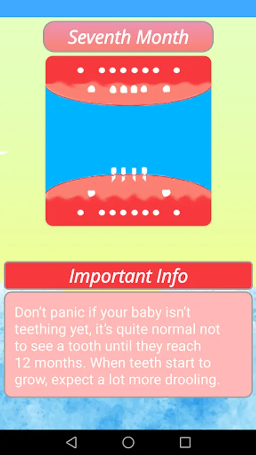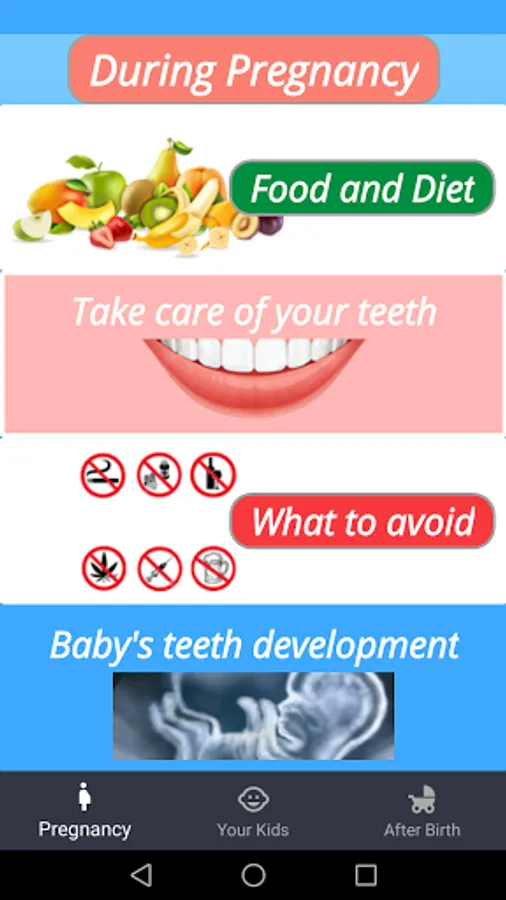 Teethy provides information about each significant for the teeth period. Starting with the pregnancy of the mother, there is info about the development, advice, and important issues, you should consider