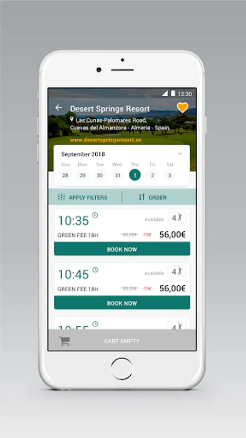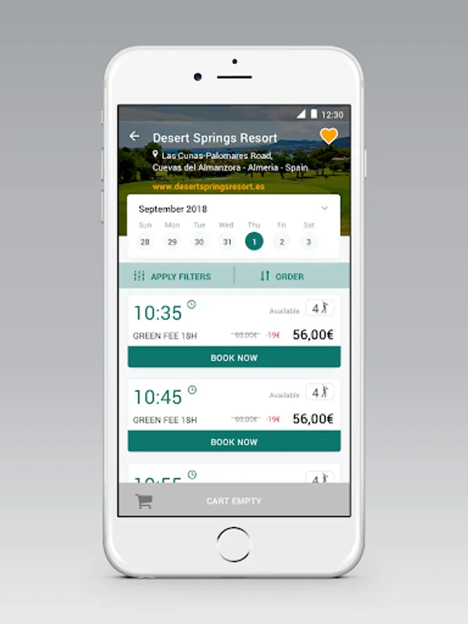 Making a booking is as simple as logging in to the app and using the search engine or map to find the course or club that best suits your needs. You can select the date and the time of the bookings, as well as the number of players. The information is saved in the shopping cart and you can modify it or delete it at any time.