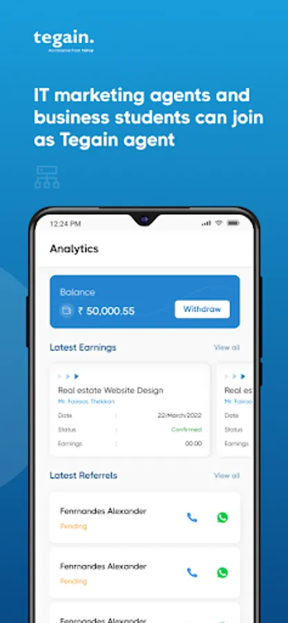 Tegain Agent App is solely designed for Marketing experts to refer IT projects and products to earn a commission in every client invoice.