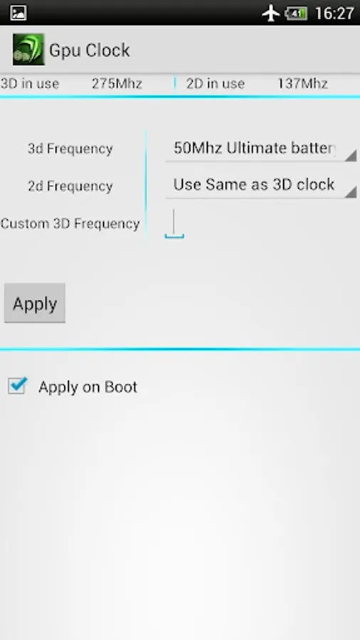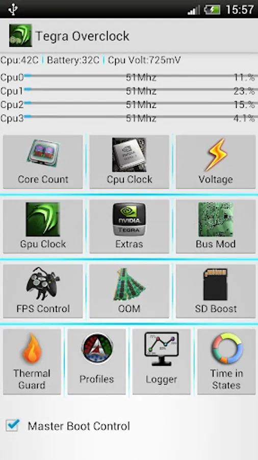 A single app to control your Tegra3 and Tegra 4 (Check Recent Changes). This tool will enable you to save power or switch to performance on fly. It covers safety features of master boot to enable/ disable your boot settings. Designed in a way that is look different than most market overclocking tools and provide easy to use interface. It can be very effective for those who are frustrated of heat problems or battery drain issues. For gamers it pack an FPS lock that help to get consistent Frame rate while saving battery when Gaming !!