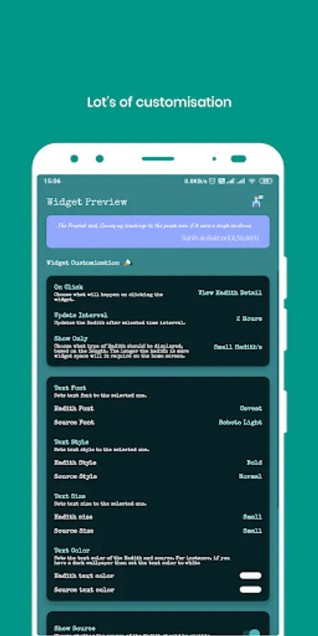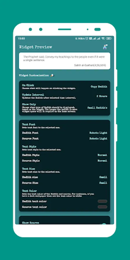 ★ Click To Change: You can click on the widget to change the current Hadith, to generate the next hadith, or to see the full detail of the hadith.