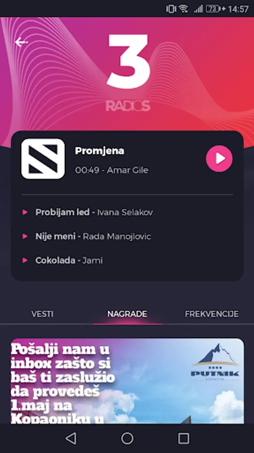 Slušaj svoje omiljene pesme gde god da se nalaziš. Zabavi se i informiši kroz dnevni sadržaj gde te takođe čeka i puno nagrada.
