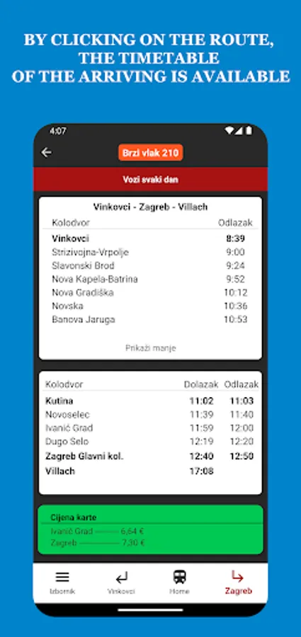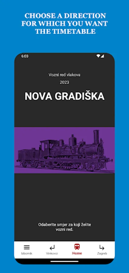 After download and installation, you can view the train schedule by selecting the Vinkovci direction or the Zagreb direction.