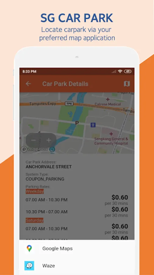 Wanting to get directions to the carpark using your preferred map application? At the carpark details page, you can select your favourite map application like Waze or Google Maps. It will open up the map app and set the carpark as the destination directly. Voilà! You can start driving without having to stop and type in the carpark address.