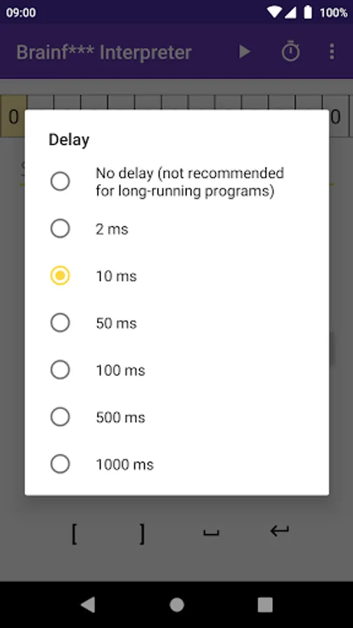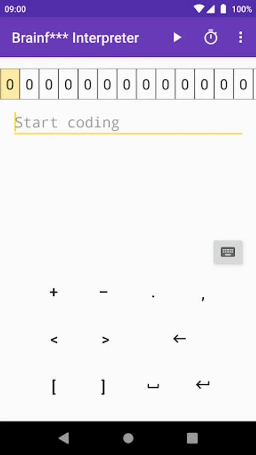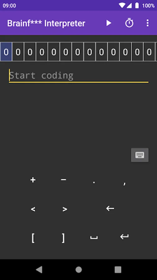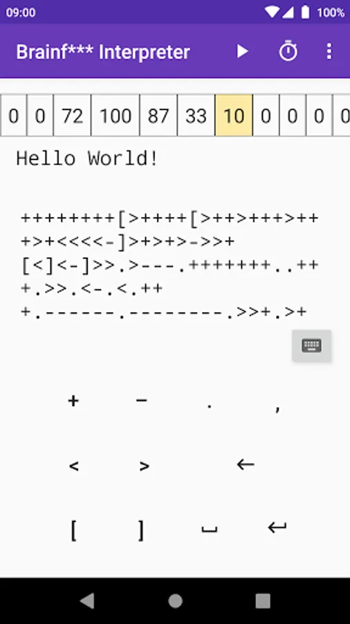 The app features a live view of the memory cells, which facilitates debugging the code and learning how the Brainfk language and interpreter work. You can add a delay in order to follow the process step by step.