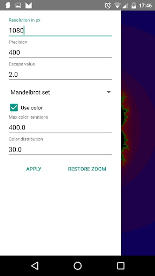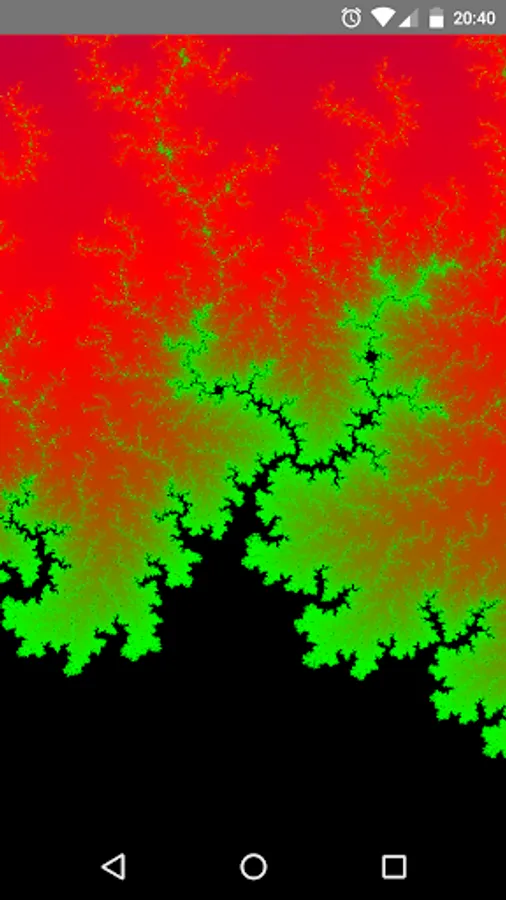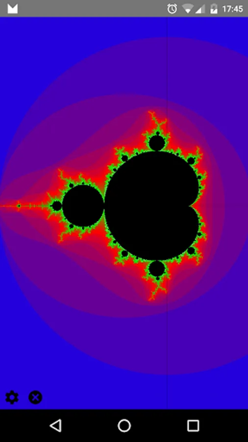 The app momentarily supports zooming in on the Mandelbrot set, Tricorn, Burning Ship fractal, and two Multibrot sets.