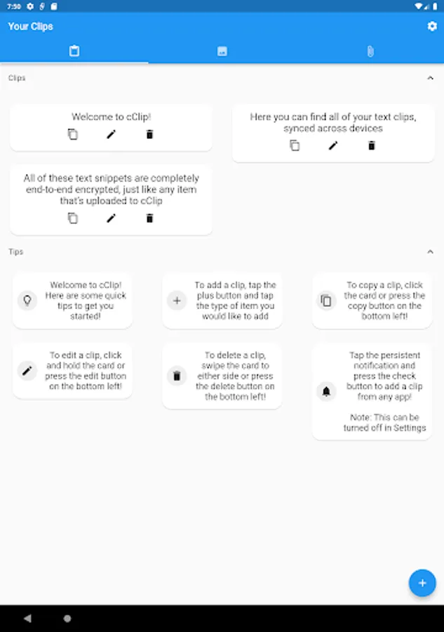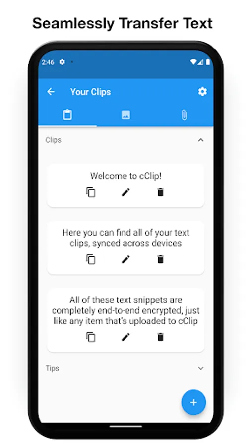 cClip is an easy-to-use and seamless text and file transfer agent built with fluidity and security in mind. cClip allows you to share any text or files through a completely encrypted storage medium. All of your information is encrypted, whether you use the intuitive and quick cClip Direct or you choose to upload to the cClip servers.