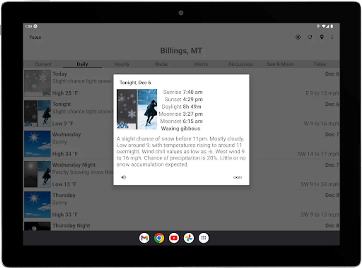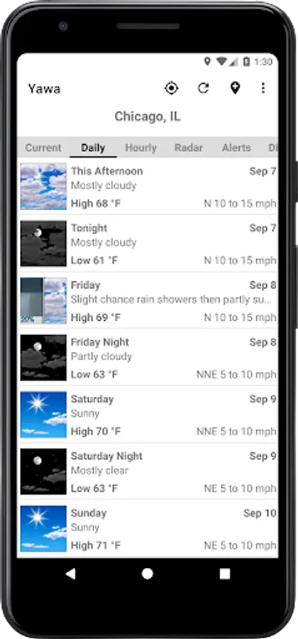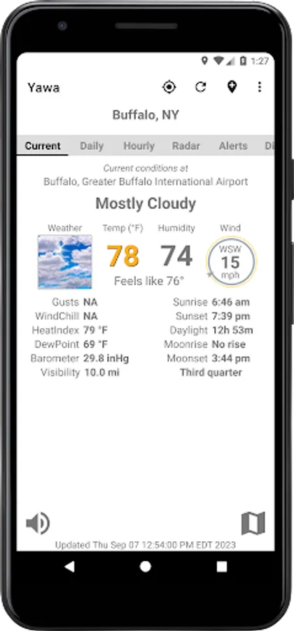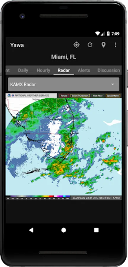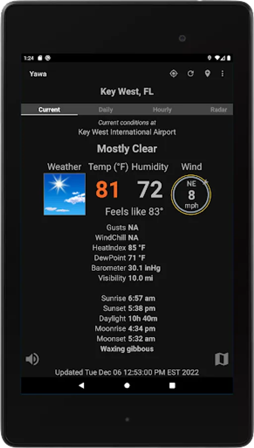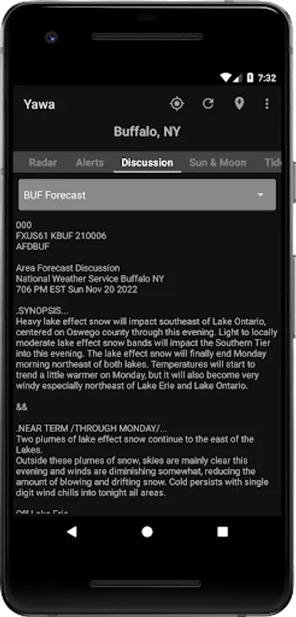 Yawa uses a tabbed layout to display current conditions, detailed daily forecasts and hourly forecasts, animated radar images, forecast alerts, satellite images, local and national forecast discussions, nearby tide predictions, sun and moon rise/set times, and an interactive map.