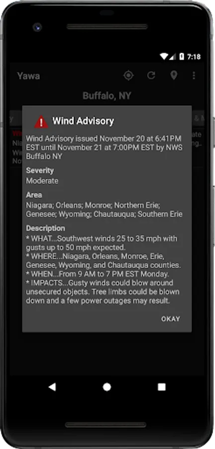 With location permission, Yawa will display the current weather conditions and forecast for the NWS grid point at the current location of the device. Yawa will continue to operate without location permission but will be unable to provide weather information for your current location automatically.