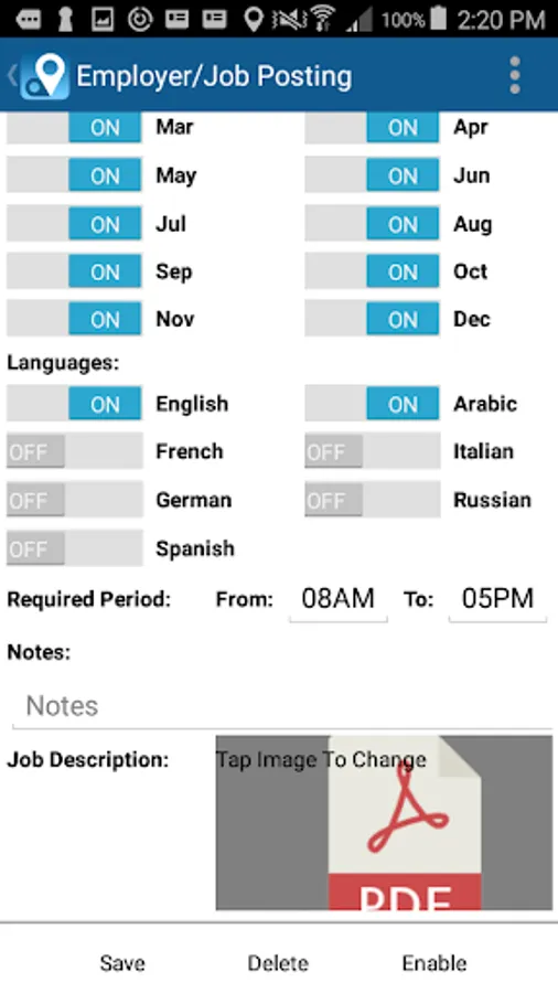 Any Employer can create a Profile specifying Company Name, Logo, Location, Industry, and Contact Info. Then post any job offering describing the offered job's Title, Job Role, Needed Experience, Working Months, Working Days, Working Period, Age Category, Education Level, Skills, and other Info by optionally including a PDF Job Description.