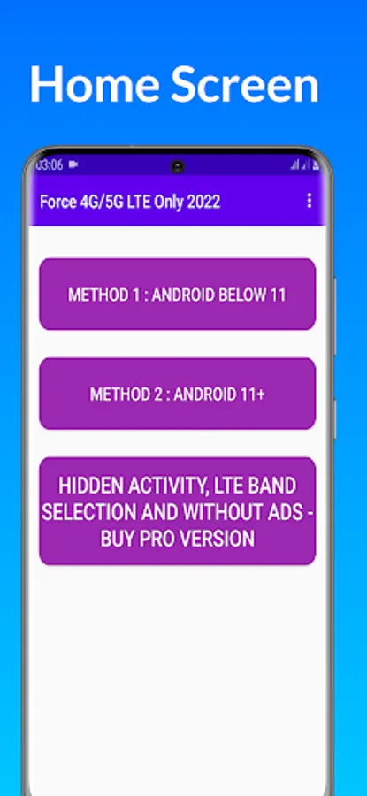 3. Upgrade to Force 4G LTE Only Pro and enjoy an ad-free experience without distractions. The app's Pro version includes lock Band Mode and Hidden Activity, which function to enter hidden activities. This feature can be used for devices that do not support all the buttons above because Android customization differs for each device issued. With the Pro version, you can personalize your network settings and enjoy faster internet speeds without interruptions.
