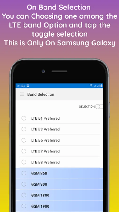 2. Band Selection: to lock the LTE Band by selecting an option then activate the toggle selection.