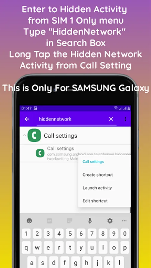 - Select Sim 1 Only - Hidden Activity - type "Hiddennetwork" in the search box. The Call Settings Application will appear. In the Activity Hidden Network section, long tap a number of menu options will appear: