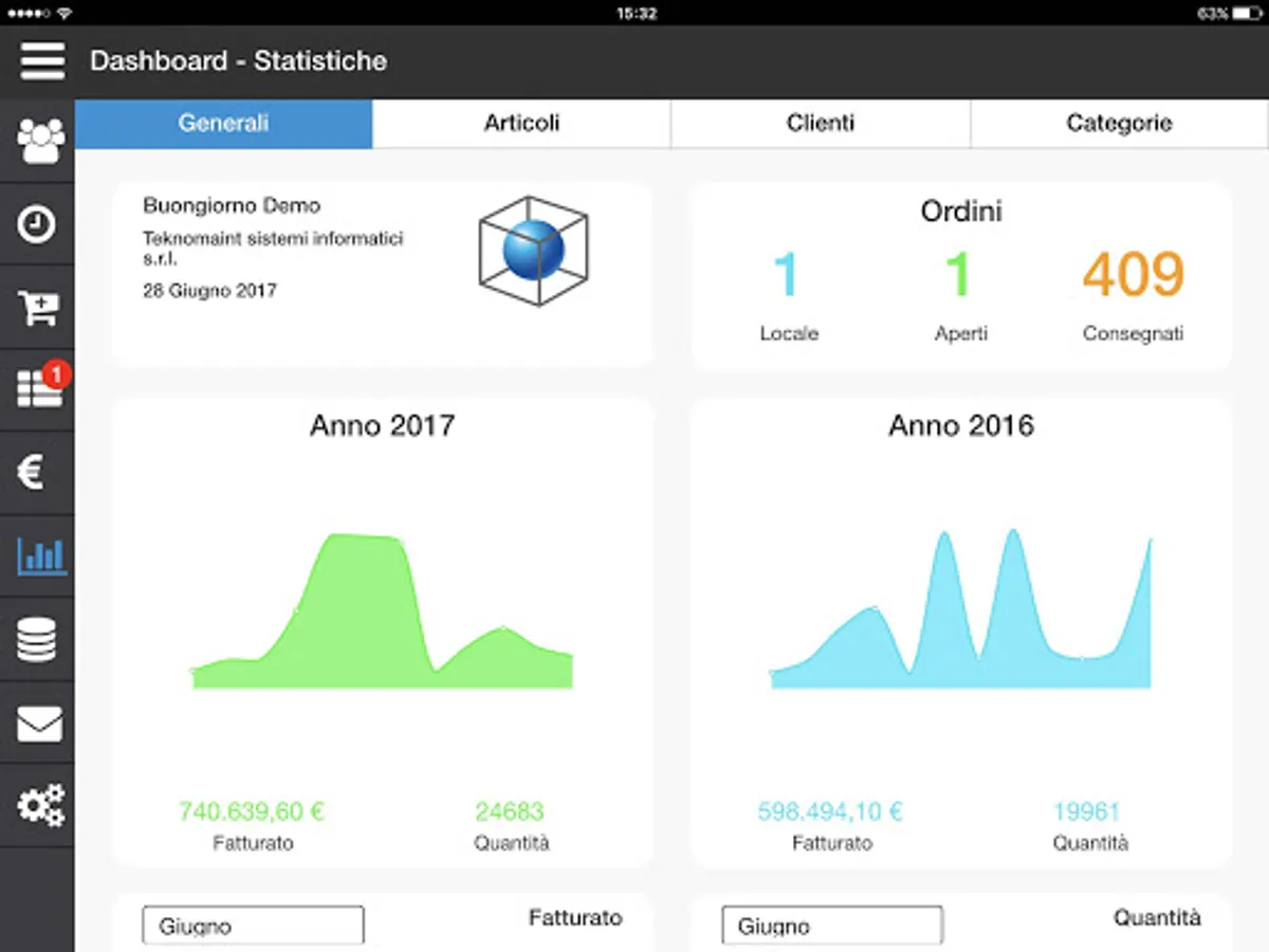 And 'appropriate application to a network of dynamic and innovative sales. The simple and intuitive interface, makes life easier in orders enclosing a single source valuable information and immediately consulted: the catalog of the complete item of product images, data sheets and price list, organization of the tour visits to optimize the time and general sales statistics, the most successful products and best customers.