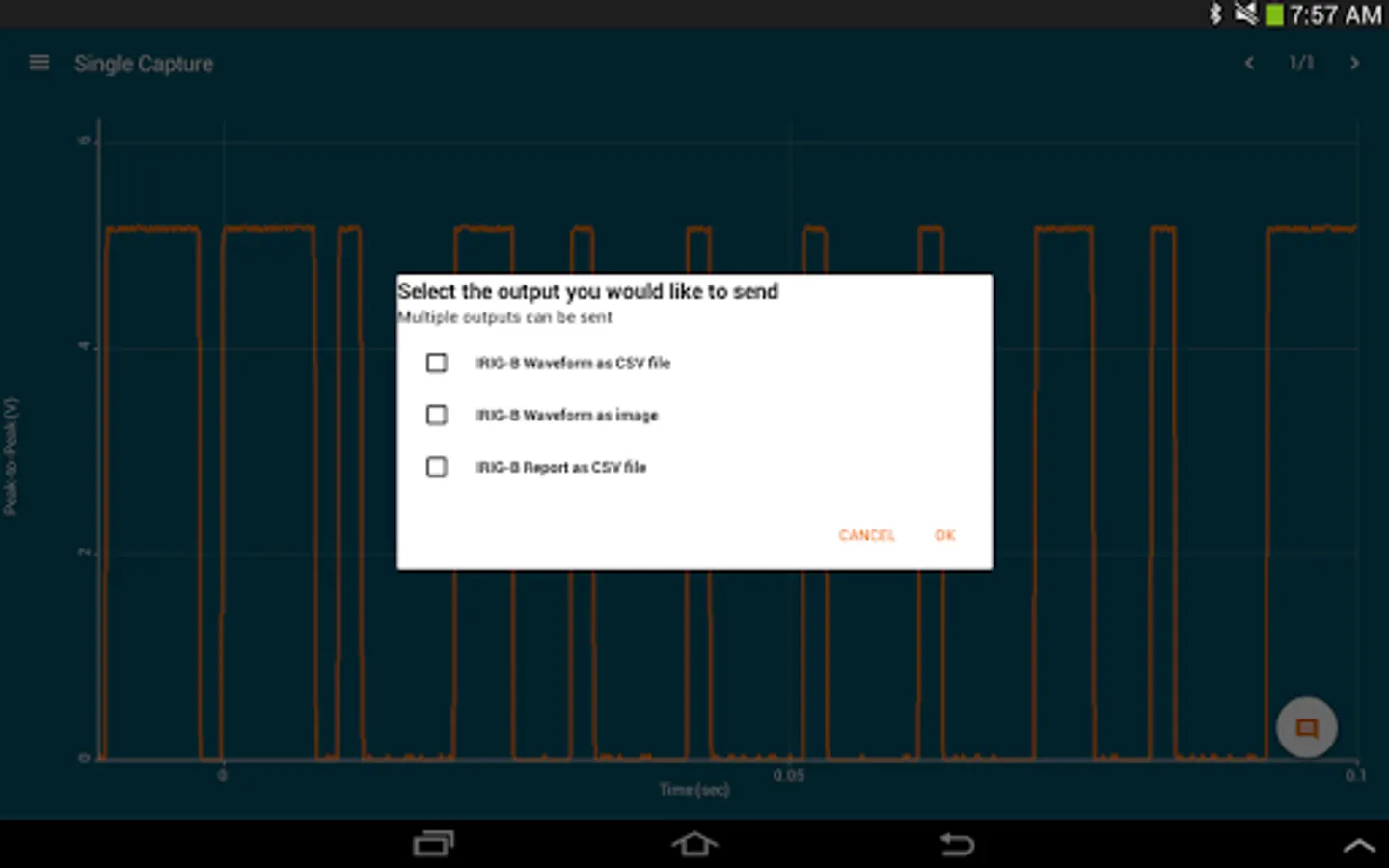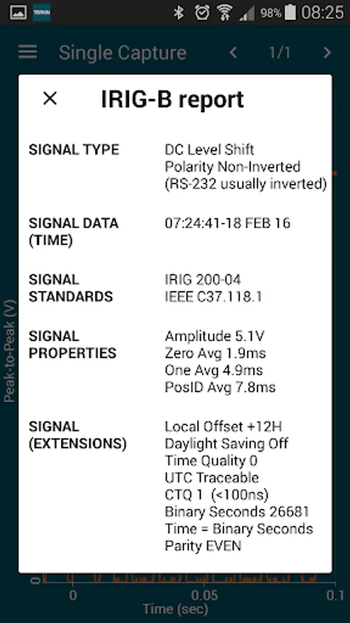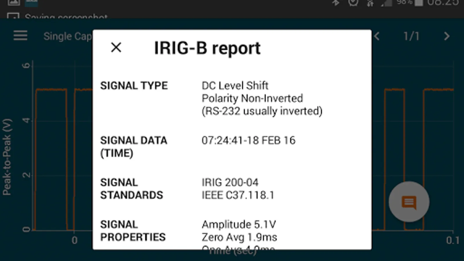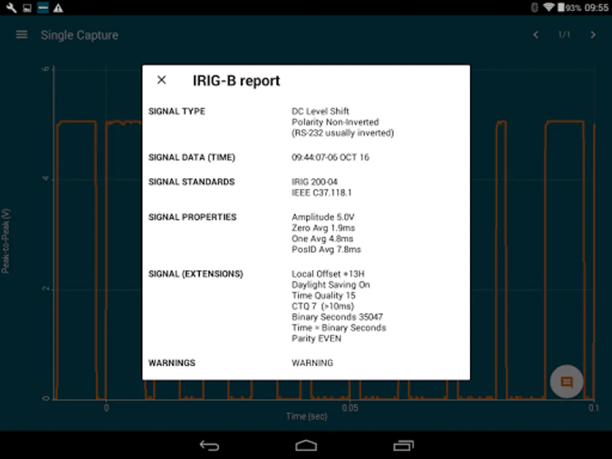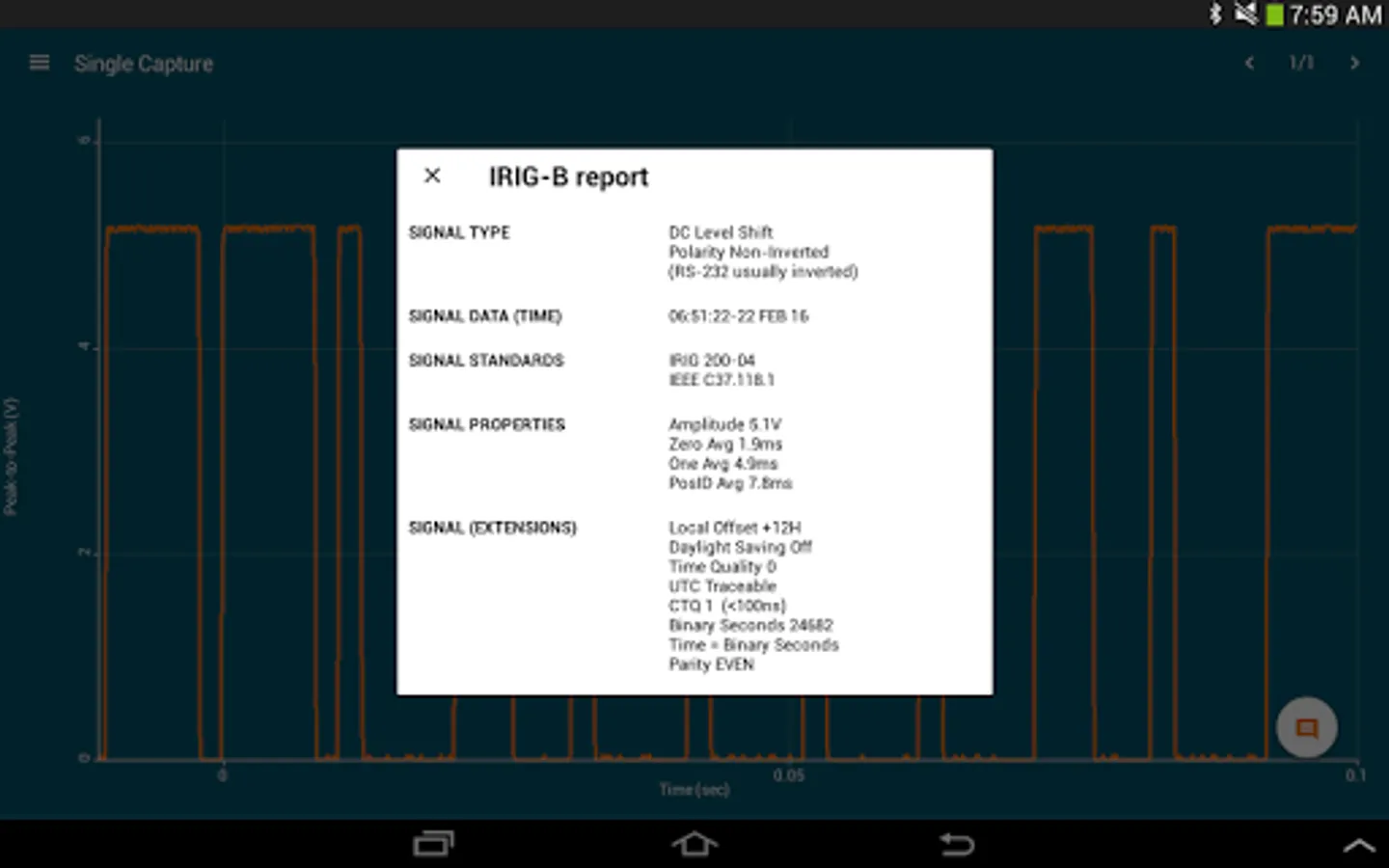 further when paired with the ScopeApp via Bluetooth. The IRIG-B Analyzer App now brings the power of an oscilloscope to the HD screen technology of any modern Android smart device. Enhanced reporting and waveform analysis creates a powerful handheld troubleshooting tool. The hands-free, wireless connection allows the user to take multiple captures with ease. With the additional capability to email recorded captures, the files can be shared with multiple support personnel back at base, thereby allowing for detailed remote analysis and on the spot resolution.