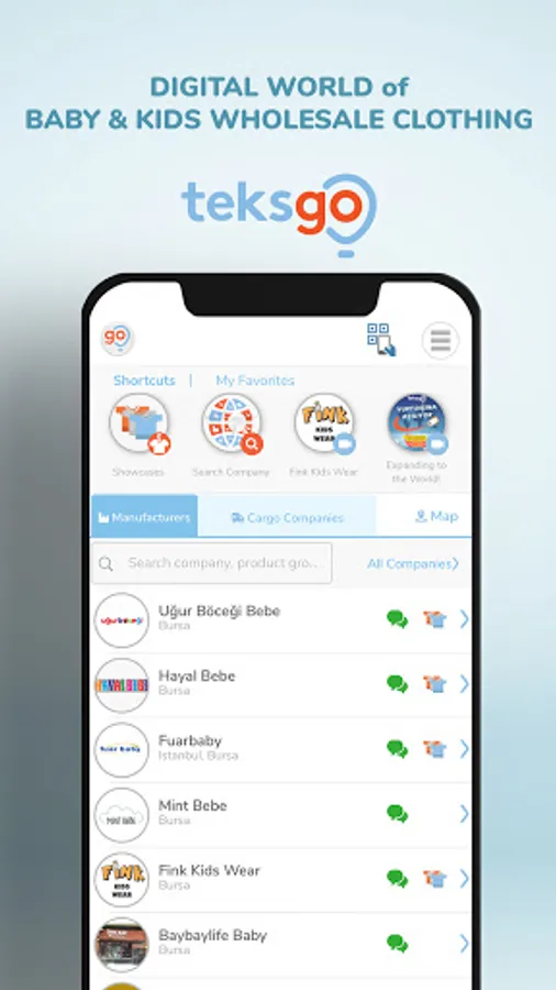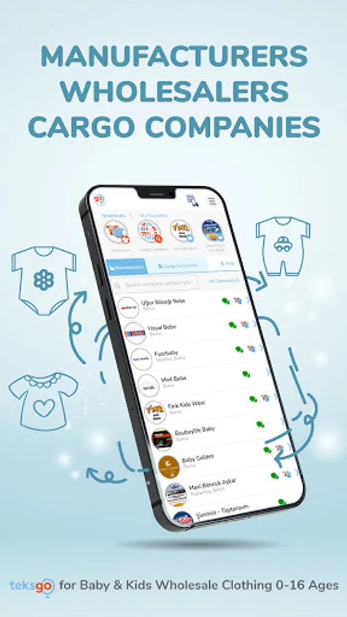 Teksgo Internet Services Android Application allows wholesale buyer “Customers” from all around the World to reach the leading “Manufacturers and Wholesale Companies” of Turkey in “Baby and Kids Wear Textile Sector”. Cargo Companies that provide logistics services to Manufacturers and Wholesalers (serving both domestically and abroad) are also included in Teksgo.
