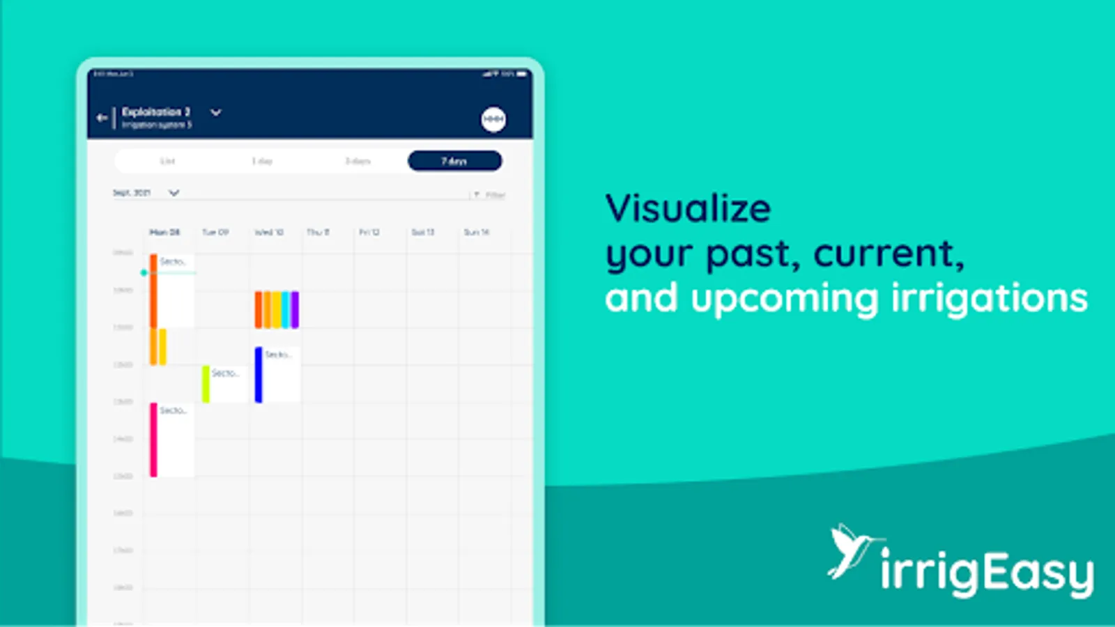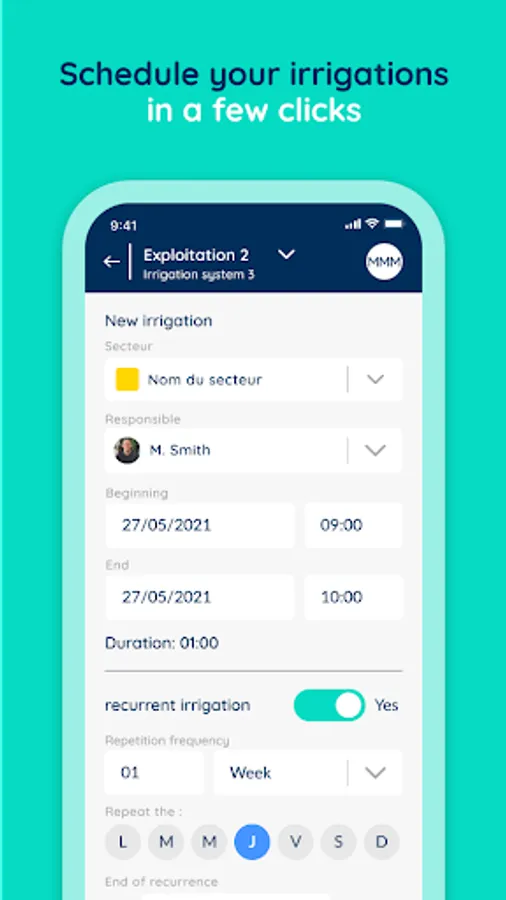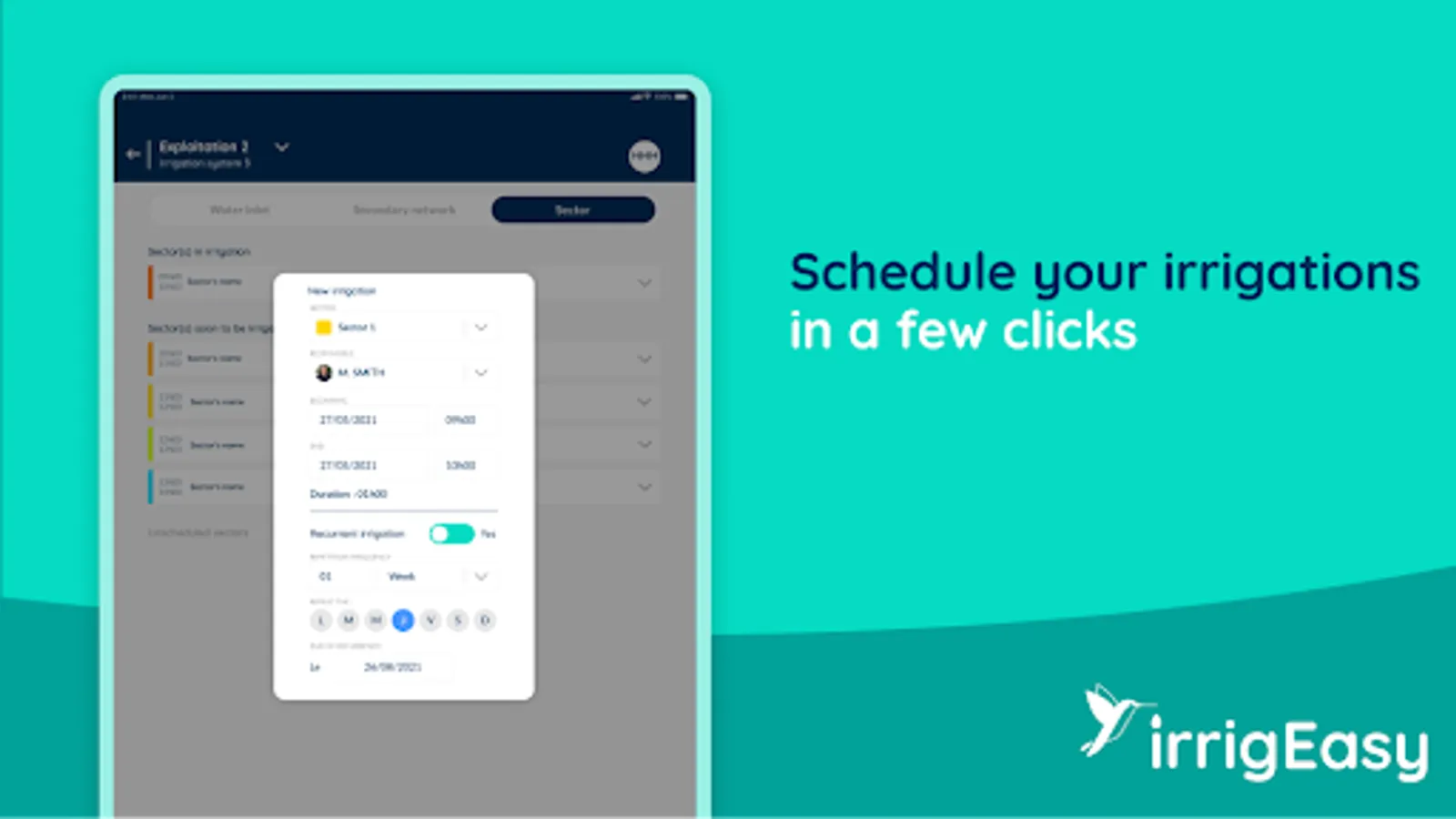 - The app allows you to make irrigation schedules in a few clicks: your sectors are configured, you just have to enter the date, duration, frequency, the person in charge, and voilà Irrigation managers are automatically informed of the schedule to be followed by sector.
