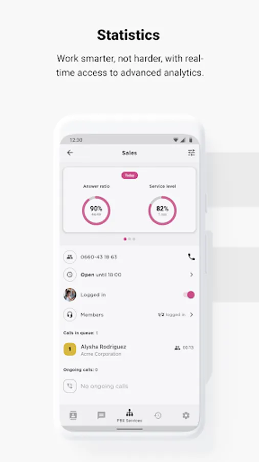 PBX services - Transfer calls to both colleagues and external numbers. You can toggle active calls from you cell phone to your fixed extension and vice versa. As an administrator, you can open and close the PBX directly in the app and listen to your messages in shared voicemail boxes.