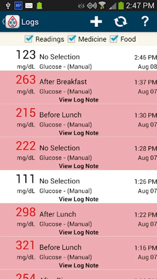 The built in logbook is updated with a single tap to display all of your BG readings from your Telcare BGM®, as well as manual blood glucose, medication, and food entries.