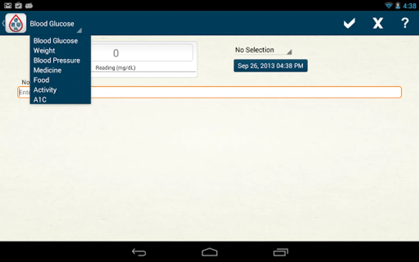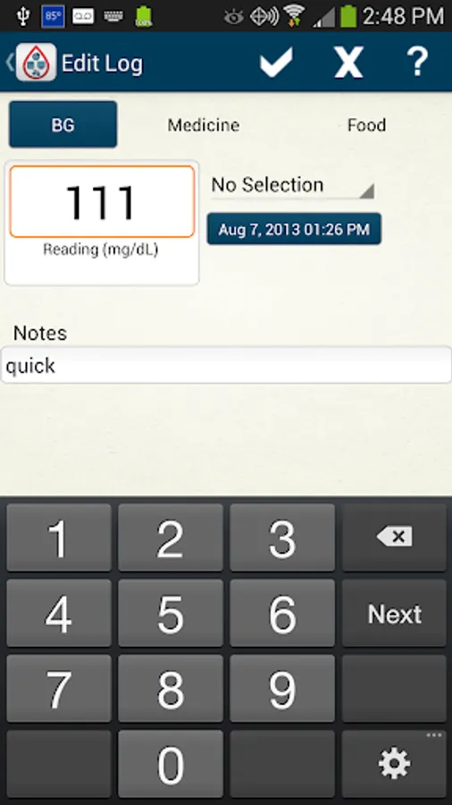 - Store BG, Food, Medication and Notes