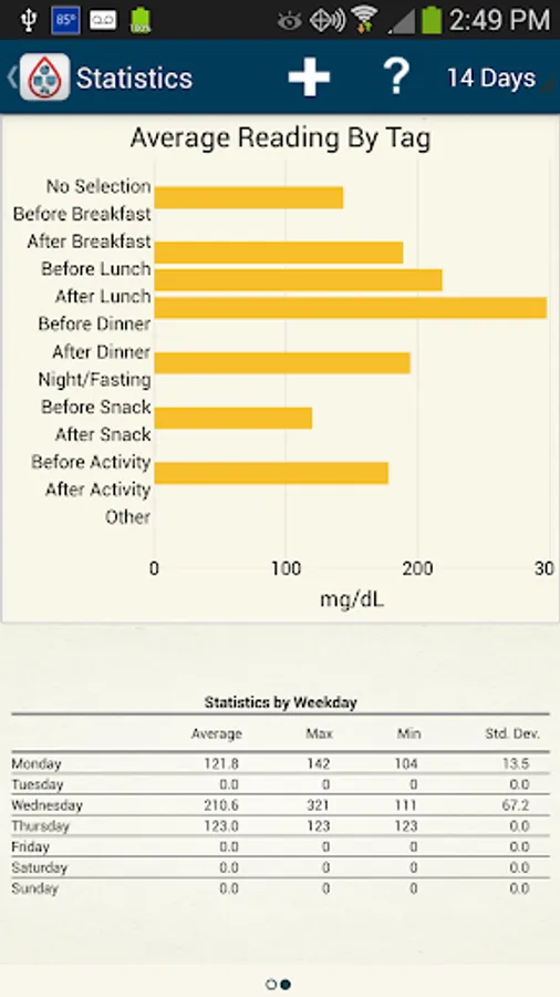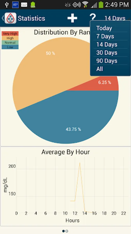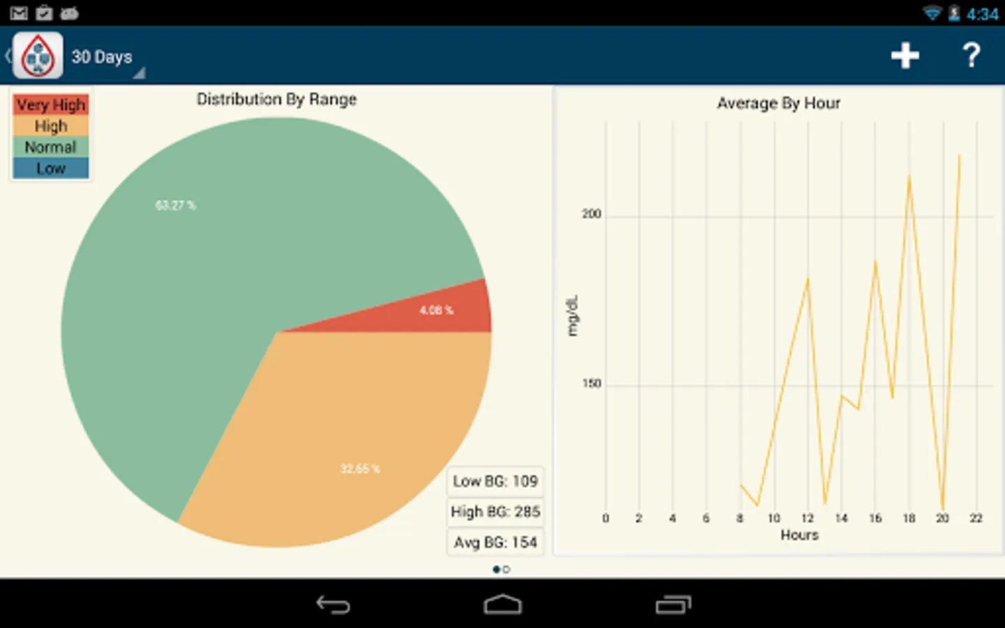 With this instant gratification also comes the ability to see automatically generated graphs of your trends over the period of time of your choice. This includes BG averages over time, averages based on meal tags, and breakdowns of your highs and lows.