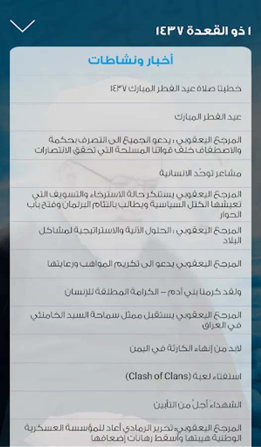 ((A specialized program to transfer conversations, letters and news Samaha religious authority, Sheikh Mohammed al-Yacoubi - long live - so that users of smart devices See all its innovation: news, activities and referendums self and his biography, as you can see the Monthly Bulletin - truthful - Bulletin visual and audio library and loaded inside the application as well further information on the early month and extremes and correspondent Eminence through (Send Astvtak) to see the provisions and legal matters trendy and modern design