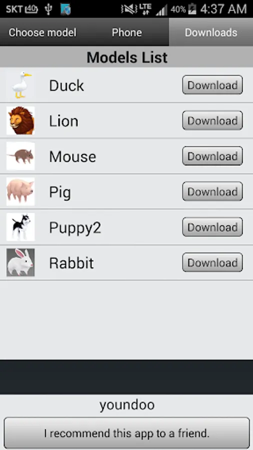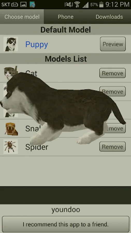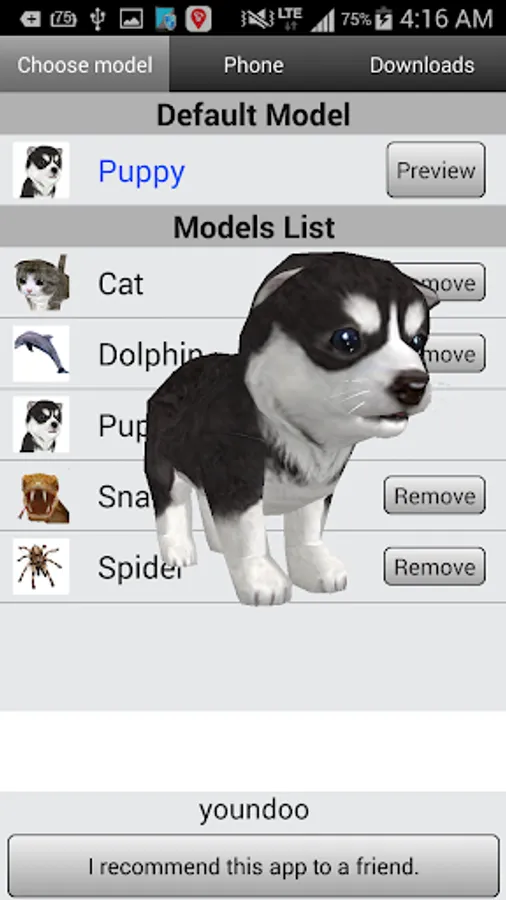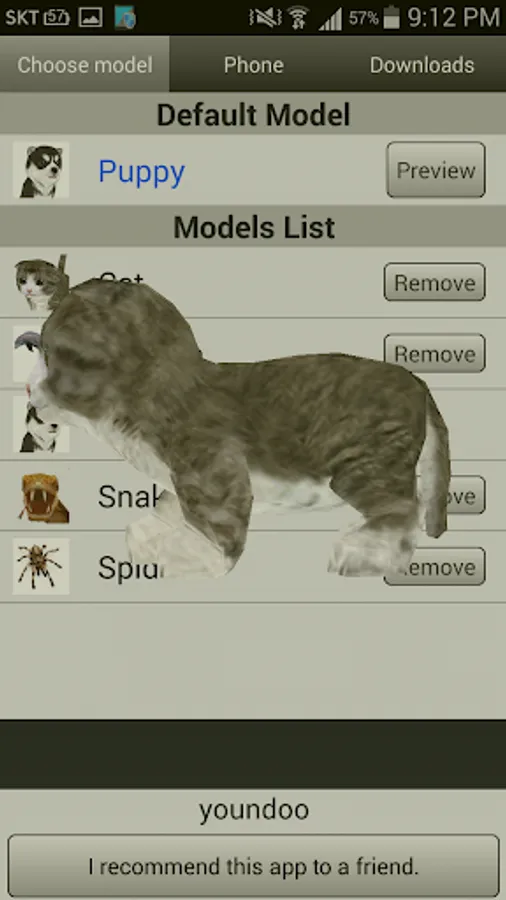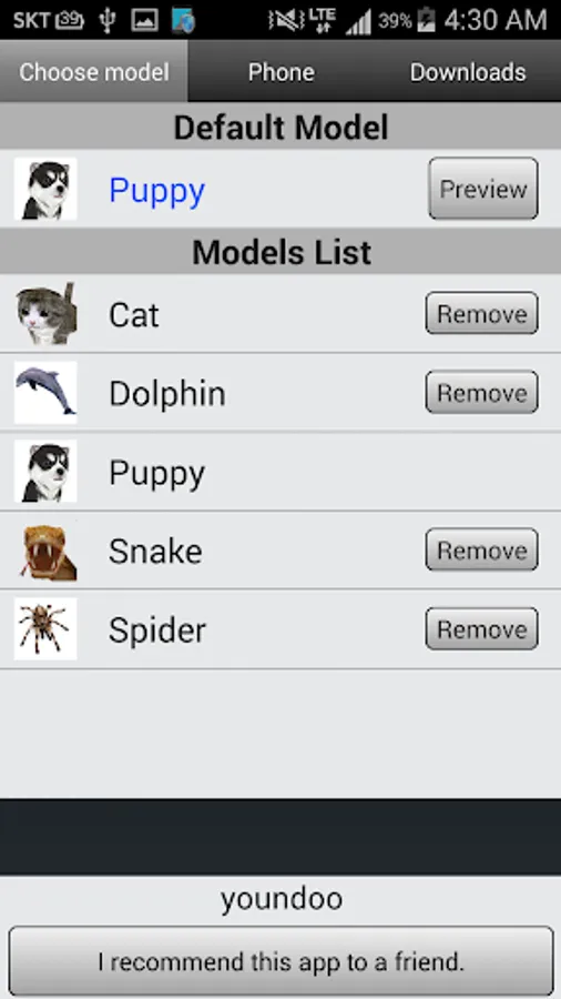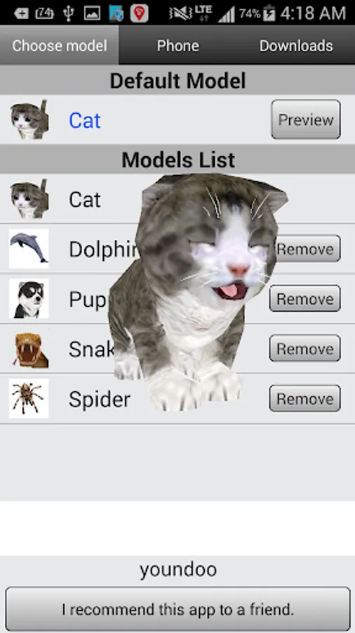 This app also includes various customization options, so if you can't decide which pet you want to use, you can assign a different one to each of your contacts. To do this, find the number of the person you want and then choose between the dog, the cat, the snake, or the dolphin. If you don't like any of these options, you can download a few others: a lion, a duck, a pig, a bunny, or a spider, among others. All of these animals are 3D, so they'll appear in a similar way no matter which one you choose.