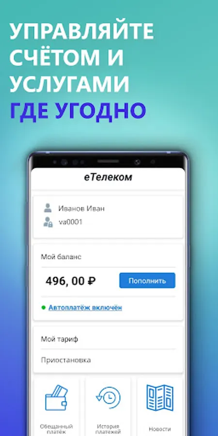 The app requires an internet connection. For authorization, use the login and password from your personal account given to you when you connect.