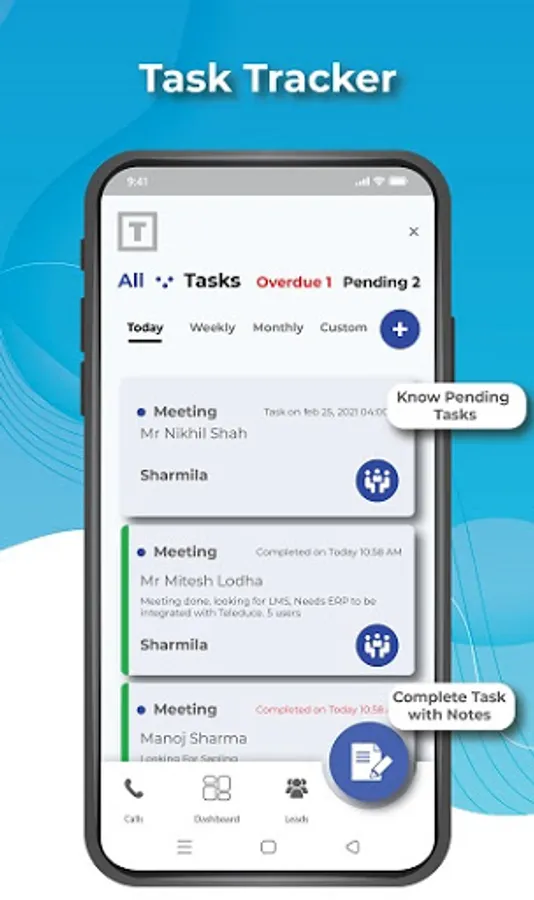 • Create/edit multiple types of tasks (Call, SMS, Email, Meeting) for you or your team members