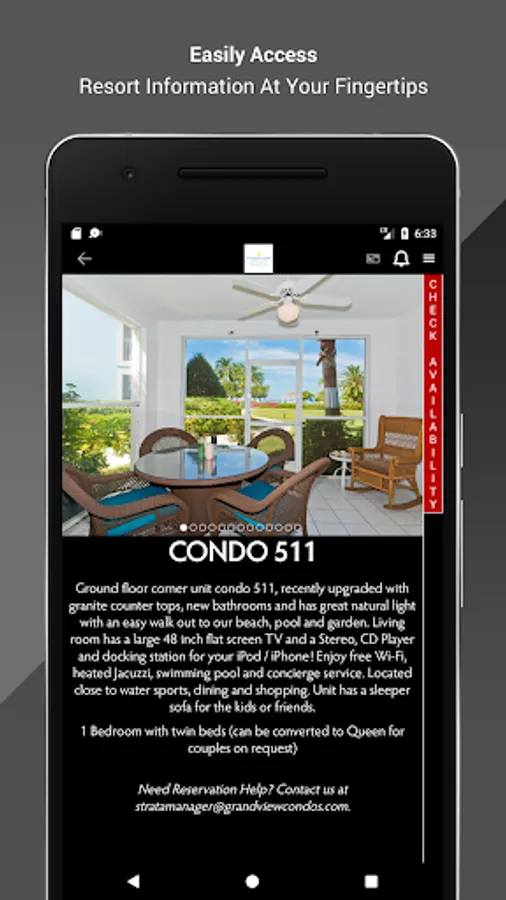 The Grandview Condos Grand Cayman mobile app showcases resort highlights, amenities and offerings as well as the finest local attractions and dining hotspots in Grand Cayman.