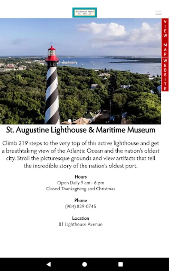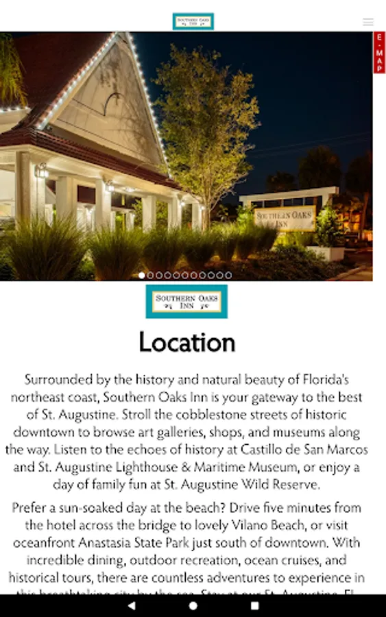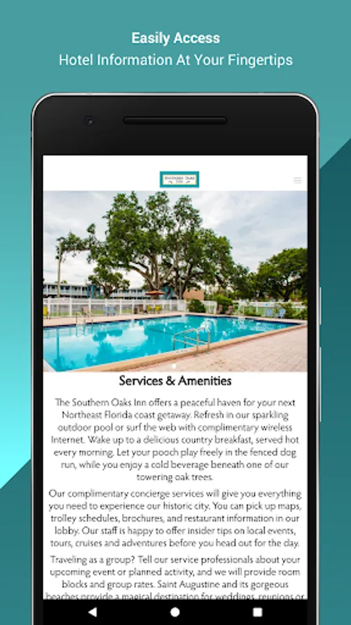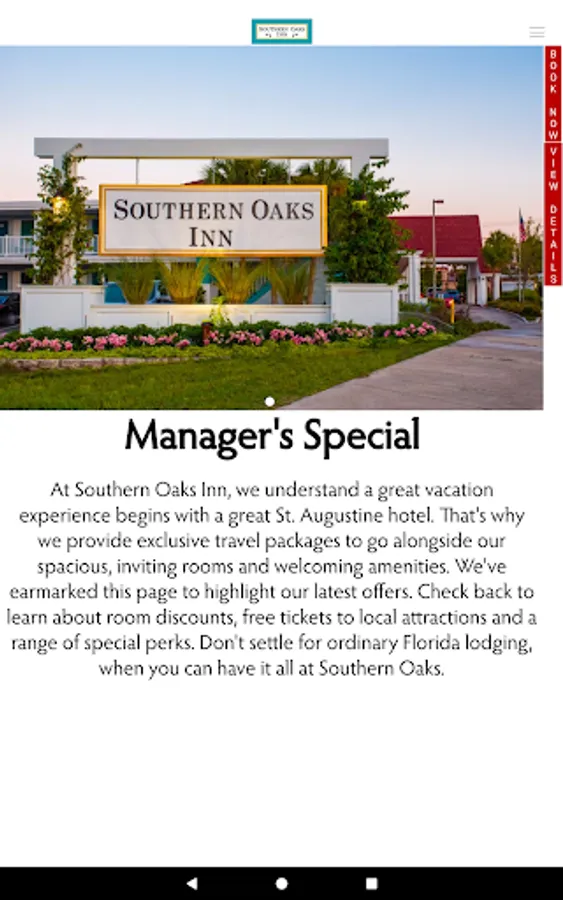 The Southern Oaks Inn mobile app showcases hotel highlights, amenities and special deals and offerings as well as the finest local attractions and dining hot spots within St. Augustine and the surrounding area.
