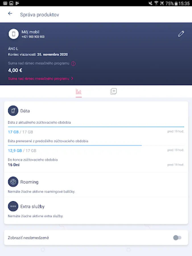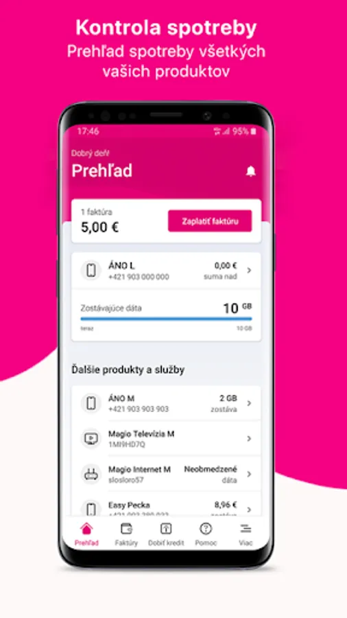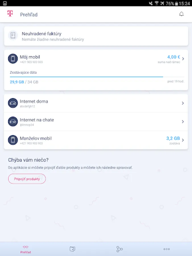The Telekom application makes it easy and convenient to manage Telekom products. For mobile phone numbers, you will see how much data, minutes and SMS you can still use in a given month. You can purchase additional data packages for use at home and in roaming. You can also add fixed network products (Magio Internet, Magio Television, fixed line) or other phone numbers to the application to keep all your products, products of loved ones, etc. together. Paying invoices is very fast thanks to the option to save your card.