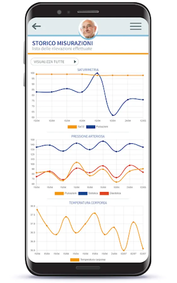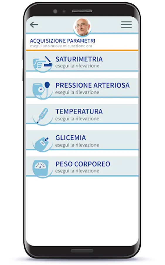 The app allows you to monitor patients at home or on the move, in relation to multiple vital parameters; typically, the app communicates with compact Bluetooth multi-parameter devices that can be easily transported in an ad hoc case or with individual devices which the user is expected to equip that allow the detection of blood pressure, heart rate, oximetry, body temperature, single-track ECG, blood sugar, weight , etc., depending on the monitoring needs.
