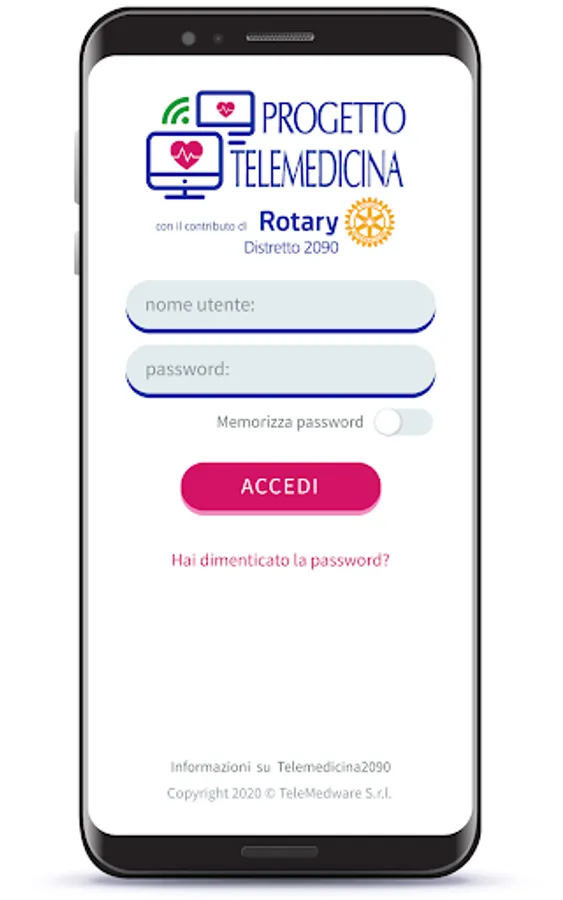 The Telemedicina2090 app can be downloaded for free from the PlayStore; however, preliminary enrollment in the remote monitoring project by your doctor is required in order to have the necessary user credentials.