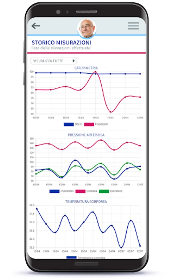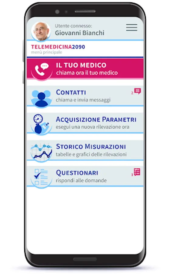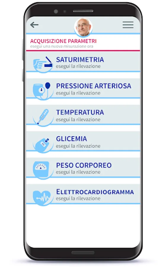 The app allows you to monitor patients at home or on the move, in relation to multiple vital parameters; typically, the app communicates with compact Bluetooth multi-parameter devices that can be easily transported in an ad hoc case or with individual devices which the user is expected to equip that allow the detection of blood pressure, heart rate, oximetry, body temperature, single-track ECG, blood sugar, weight , etc., depending on the monitoring needs.