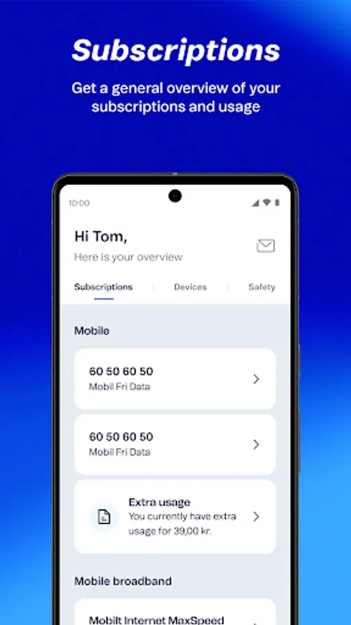 You’ll find all the important information about your subscription(s) in the app, such as your sim card number, PUK code and broadband number plus the name and the price of your subscription.