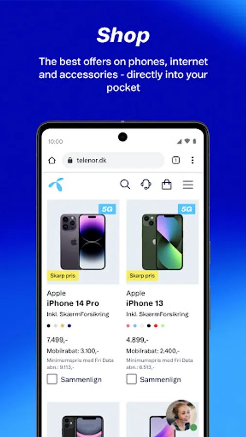To get full access to the app you need to be a Telenor Denmark customer and have a Telenor ID account. If you do not have an account, it’s easy to create one in the app. You can also use the app with limited access via SMS login, which also works for B2B users.