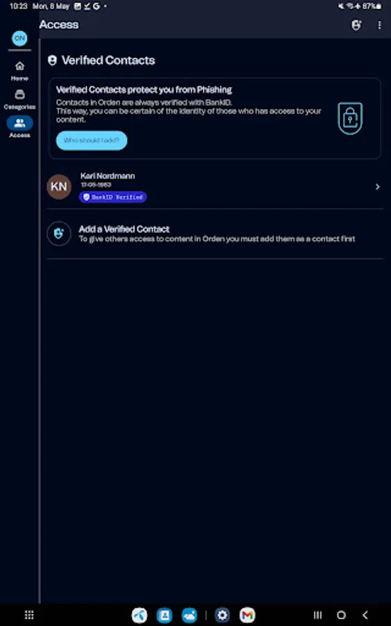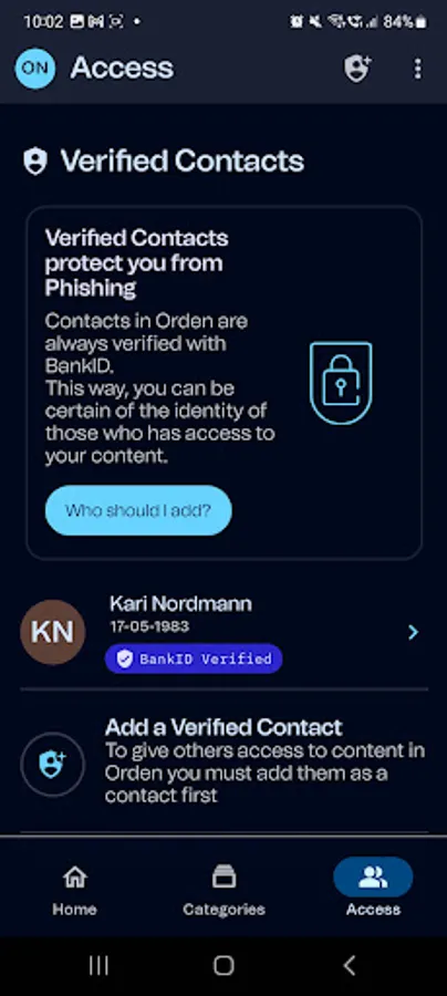Orden uses BankID for identification upon signup and when you grant access to information. This way you are always sure who has access to the content. The app encrypts all information when it is stored and sent. This means you can be completely confident that your content is always secure.
