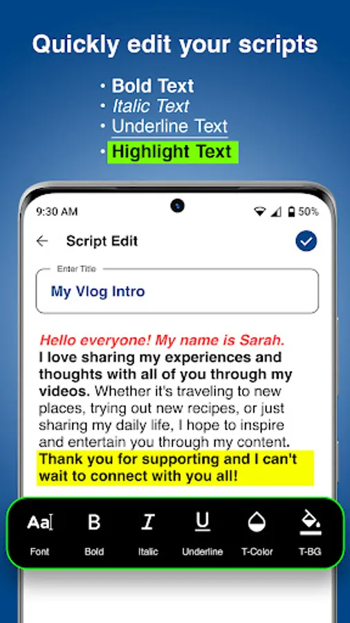 Teleprompter for Video Makers is a fully customizable scripting option to edit the script with all required scripting tools like text highlighter, font styles, point indication, and more. Even more, you can control your floating text speed while speaking.