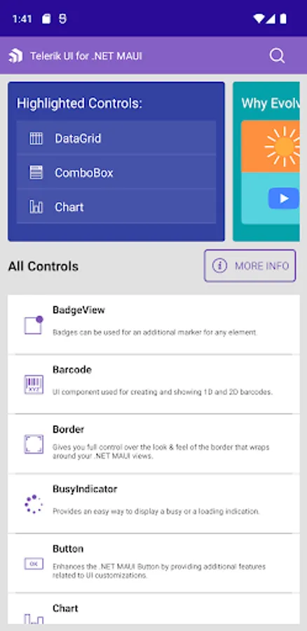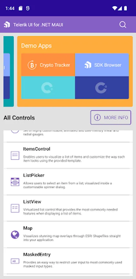 Telerik UI for .NET MAUI is a library of powerful, customizable UI controls for building native cross-platform mobile and desktop applications with C# and XAML. This UI suite allows you to target Windows, macOS, Android and iOS from a single shared codebase. In this app, you can see in action many of the 60+ .NET MAUI controls in the library, such as: