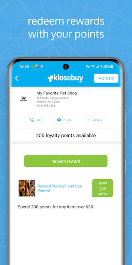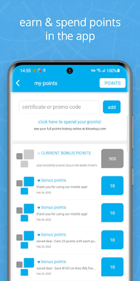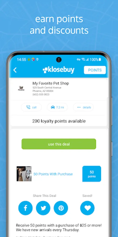 Earning points is easy. Automatically receive points for joining Klosebuy, favoring businesses, and referring friends. Collect more points from your favorite businesses through deals and specials, on your birthday, and even for sharing offers on social media.