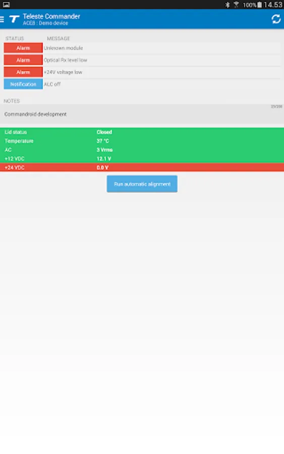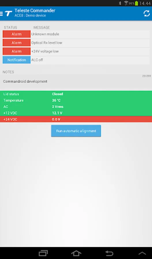 Teleste Commander is a service terminal application for Android smartphones and tablets. It is the answer to our customers’ wishes for improved usability and local management via a personal mobile device. Teleste Commander supports wireless connectivity over AC6901 BT adapter. USB cable connection is also supported but depends on Android device hardware.