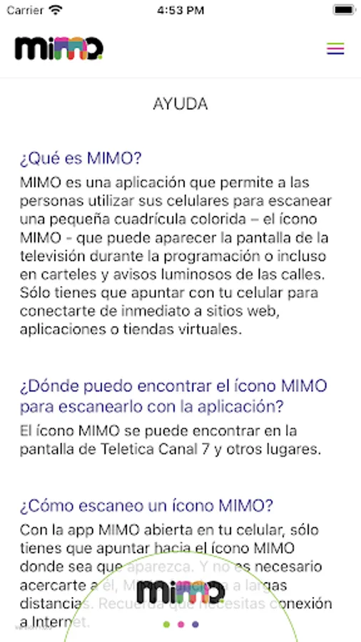 Mimo is an application that allows people to use their cell phones to scan a small colorful cube, the Mimo icon, which can appear in the corner of the TV screen during programming or even on billboards and street signs. You just have to open the application, and point with your cell phone to connect to a world of opportunities that only Mimo will have for you!