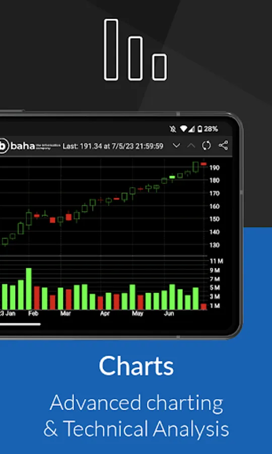 - Candlesticks, OHLC Bars, Mountain or Line charts (incl. Volume)