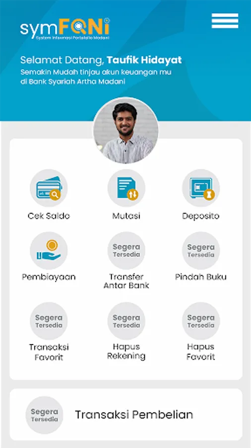 Symfoni (Madani Portfolio Information System) Mobile is an application owned by BPRS Artha Madani to access accounts owned by customers using 3G/4G/5G and WiFi technology via smartphones.