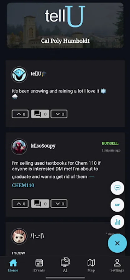 Discover and share campus events or sightings in your area with tellU! Connect and chat with new friends nearby. The tellU app puts students into chat rooms with their fellow university students. Post about nearby campus events or sightings, or just chat about the school! (For Cal Poly Humboldt, UC Davis, and UC Berkeley)