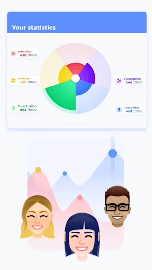 Focus - Train your brain has a statistics section where you can see your cognitive evolution during the last week, month or year. In addition, the app offers you a cognitive summary in which the average scores of the results of your daily workouts are shown. Find out your progress thanks to brain training!