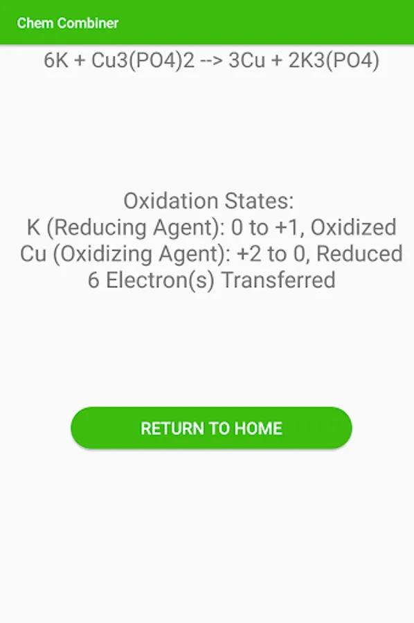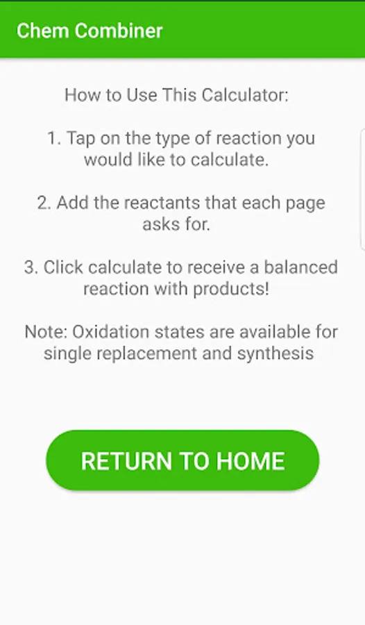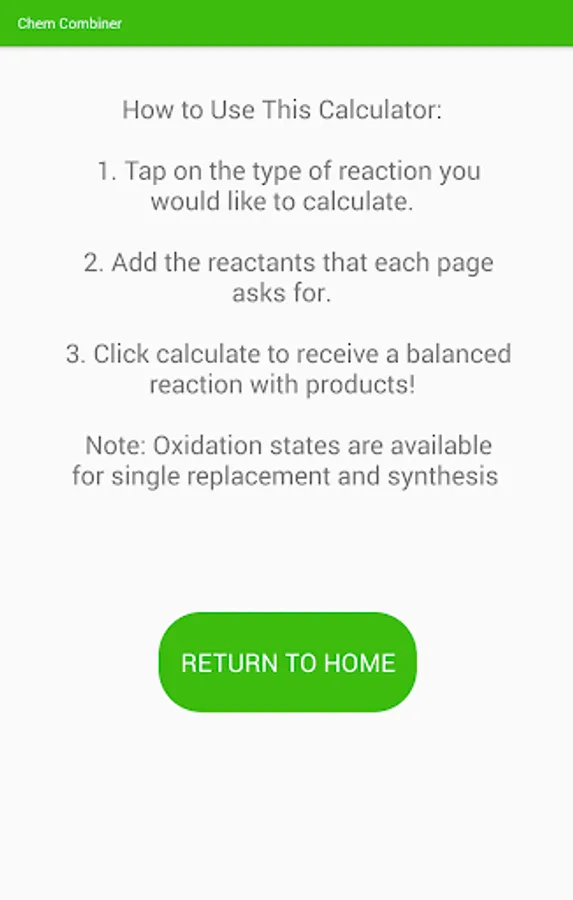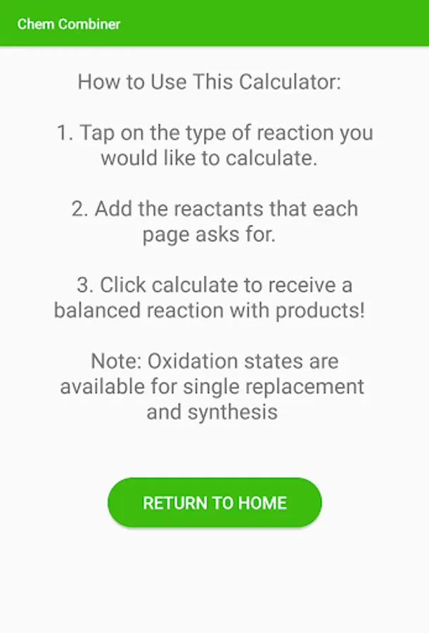 Chem Combiner is a chemistry calculator that allows users to select the type of reaction they would like to calculate for, and only requires an input of reactants. It will return a fully balanced reaction with coefficients, reactants, and products completed along with reduction-oxidation information for applicable reactions.