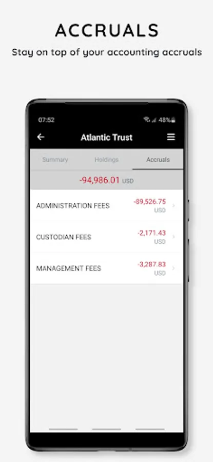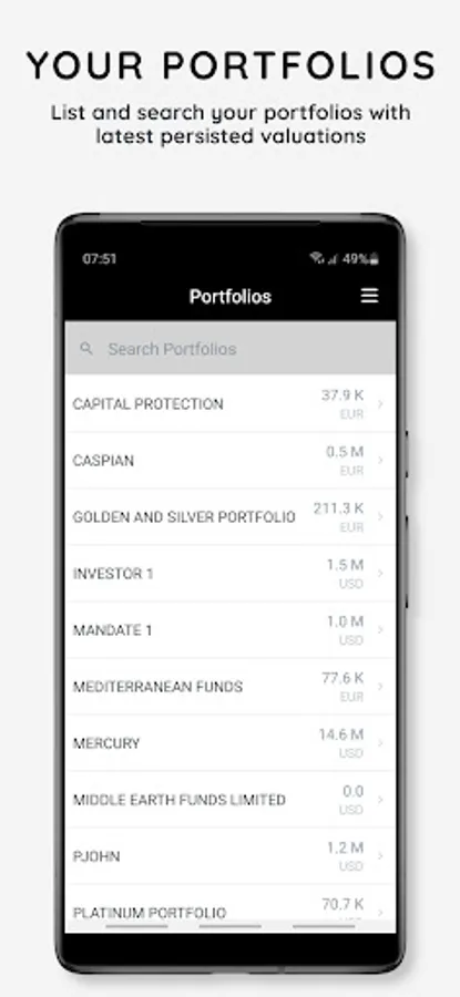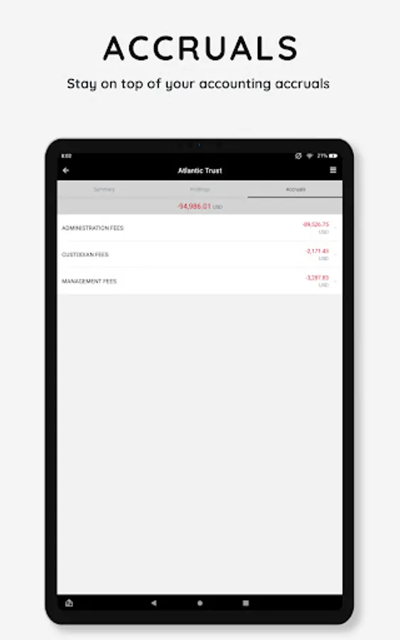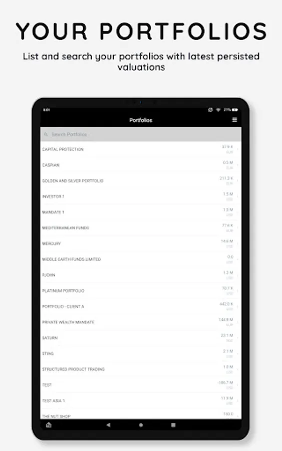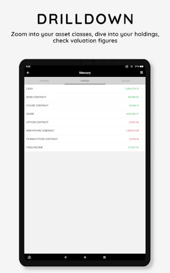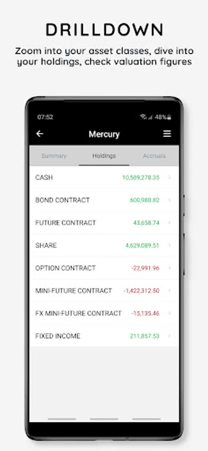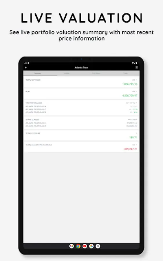 - Get most recent, live portfolio details for total valuation, individual holdings categorized by asset classes and accounting accruals.