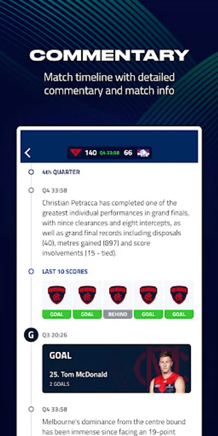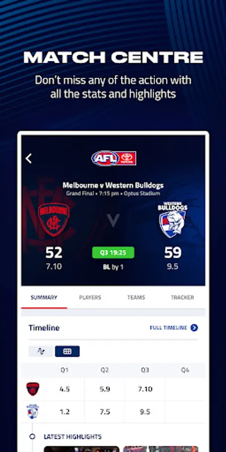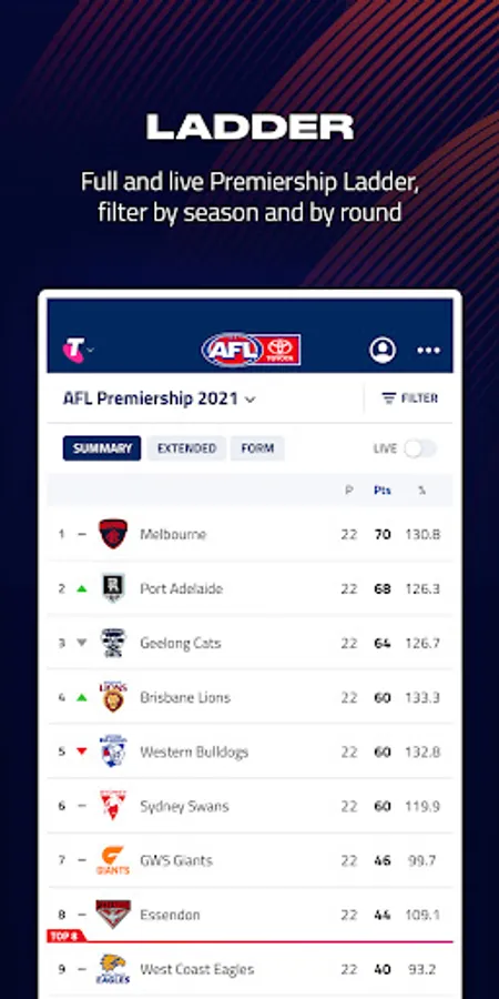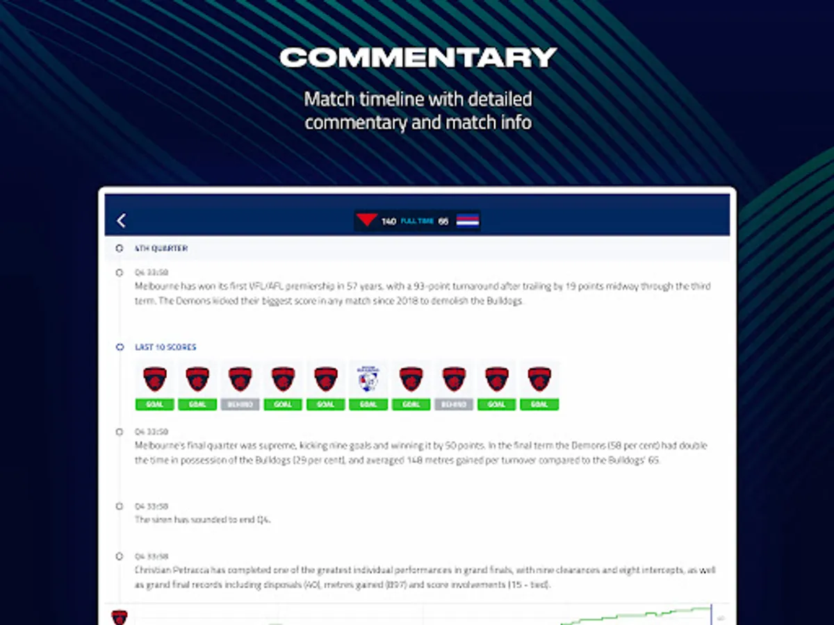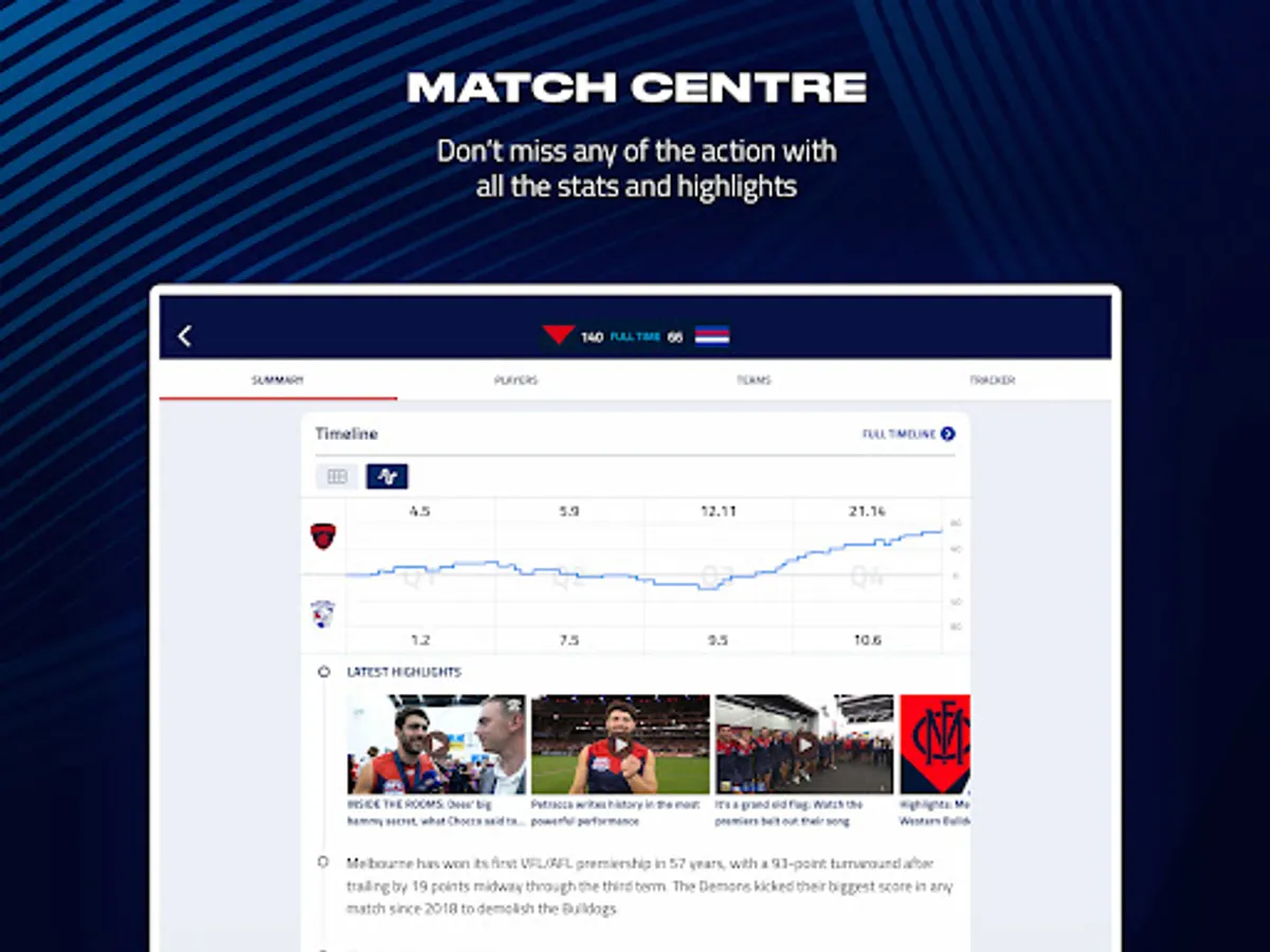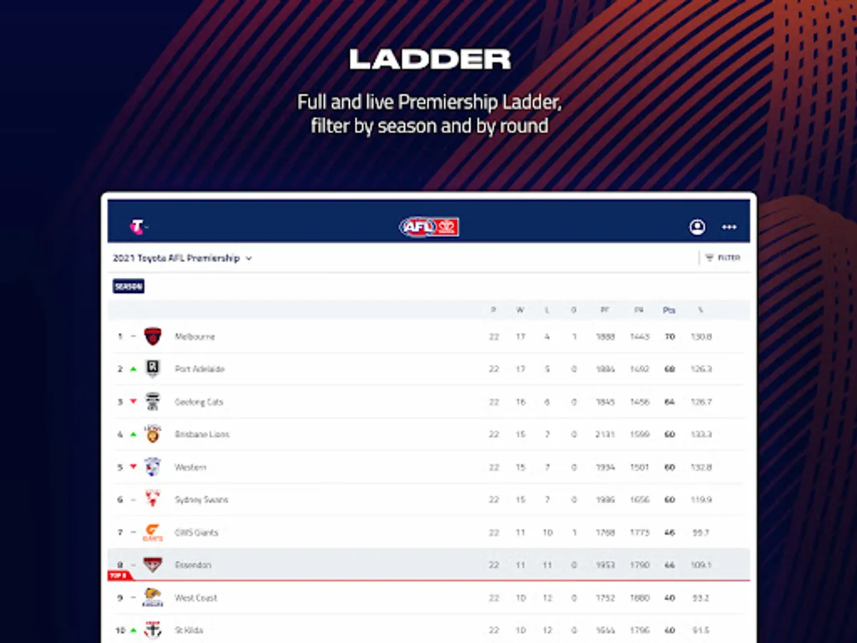 • View comprehensive stats for every match, plus live scores and the live ladder